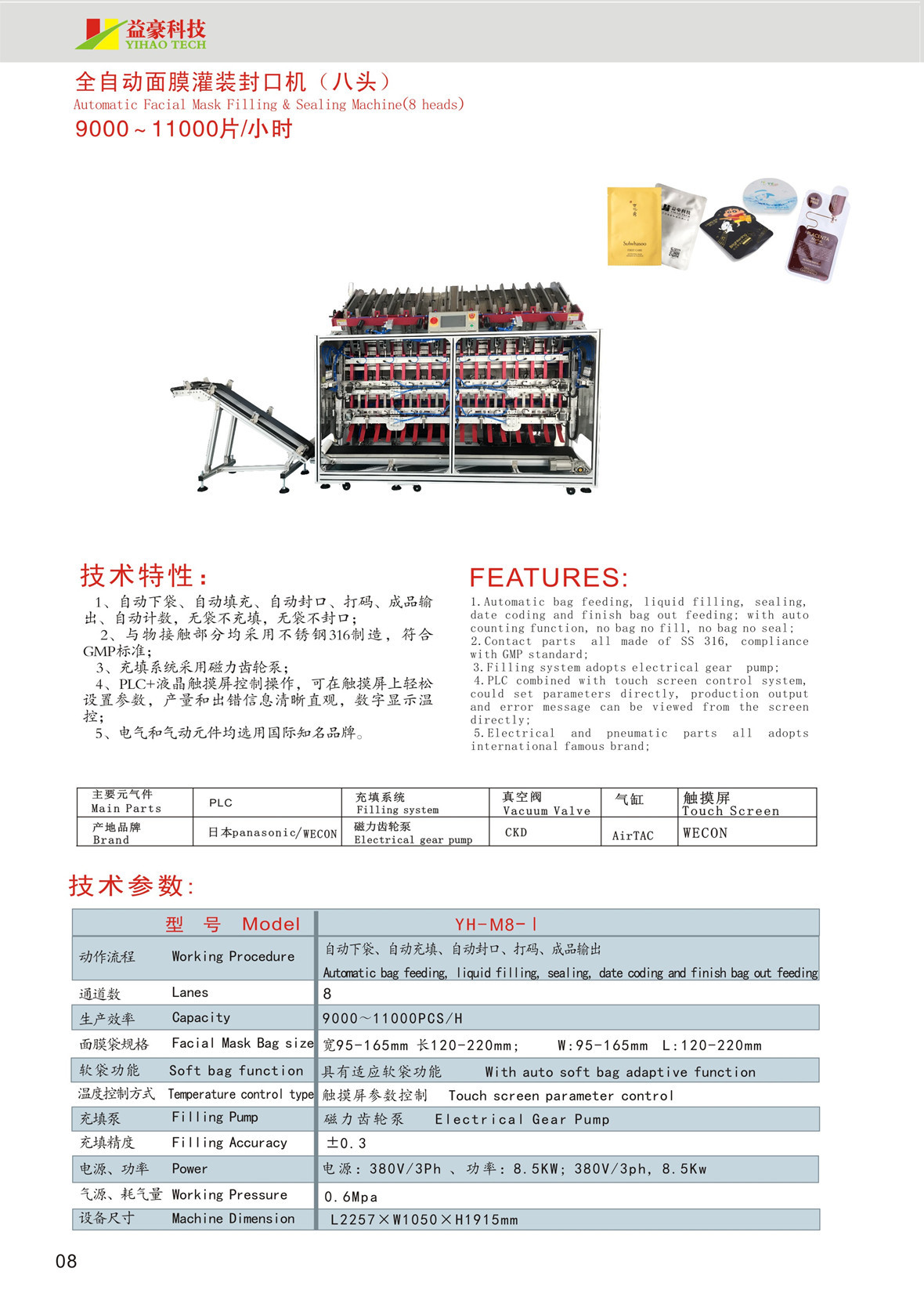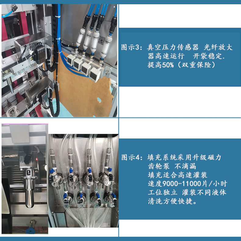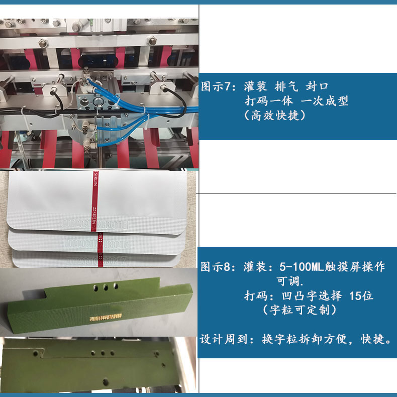 1、自動下袋、自動填充、自動封口、打碼、成品輸出、自動計數,無袋不充填,無袋不封口;