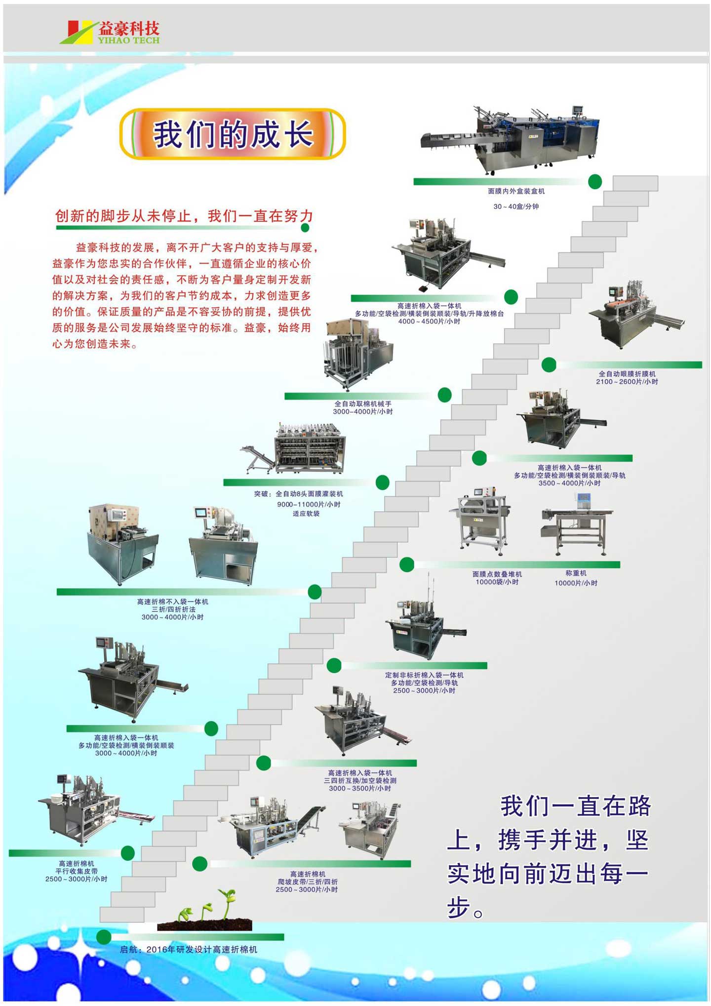 深圳市益豪科技有限公司是一家集研發設計、生產、銷售為一體的高新企業設備廠家,公司研發生產的“高速折棉入袋一體機”市場占有率達到85%以上,極大的提高了面膜的生產效率,極大的促進了面膜的自動化生產。公司強大的研發團隊是源源不斷的技術創新的源泉,公司最新推出的“全自動面膜機”是對現有面膜機的一個質的飛躍,解決了現有立式面膜機做軟袋不穩定的缺陷,同時,公司也推出了膜布檢測機、面膜點數推堆機等新品。公司成立了一支以高級技工、高級工程師等專業人才組成的優秀研發制作團隊,時刻把握著科技發展動態以及用戶的市場需求,研發出符合客戶需求的新產品,用先進的技術、科學的管理、卓越的品質、快捷周到的售后服務,為客戶提供整體解決方案以及技術支持,我們將以可靠的產品質量、合理的價格、優質的服務來贏得客戶的贊揚和信賴!