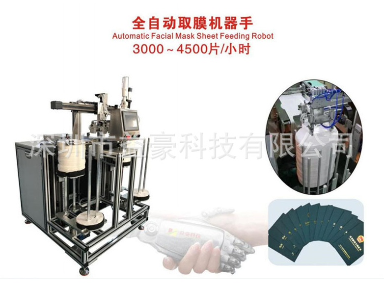 設備主要功能為面膜的取膜、發膜、在生產過程中只須將成沓的膜布放在治具上,設備完成自動取膜、發膜,實現了半自動折膜機的自動發膜,完全代替人工操作,改善了生產工人的勞動強度,且一人可同時操作多臺設備,有效提高生產效率,降低生產成本。